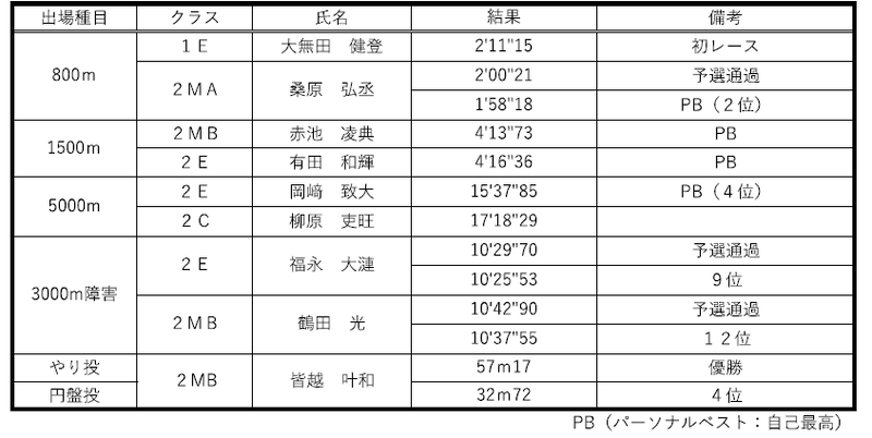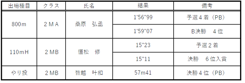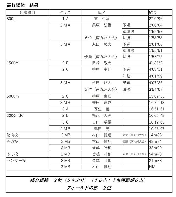最高成績は800mで昨年度の結果を上回る3MAの永田が優勝(球磨工業長距離ブロック歴代1位 )しました。また同じく800mで2MAの桑原が6位入賞