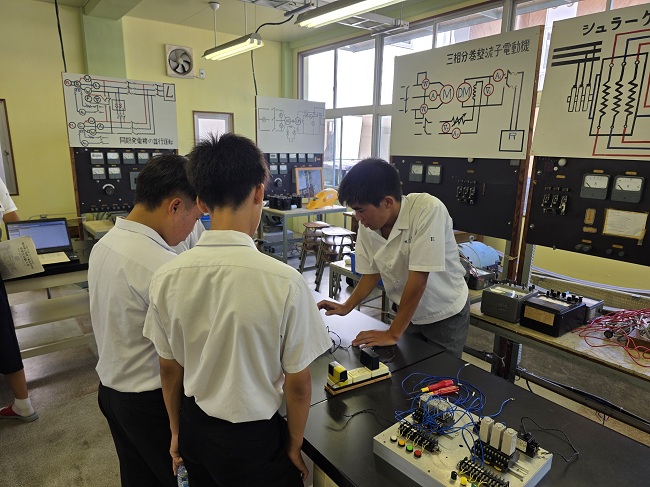 7月30日(水)体験入学が暑い中、実施されました。参加人数は、生徒・保護者・教員合わせて、午前中が166名、午後が167名、合計333名の参加でした。電気科では、電気科の説明の後、電気工事、シーケンス制御、高電圧実験、電気機器の体験、ロボット実演、各ゲーム体験に分かれて、持ち時間25分の説明・体験を行いました。今年から電気科3年生と1年生が各ブースに分かれて説明をしてくれました。