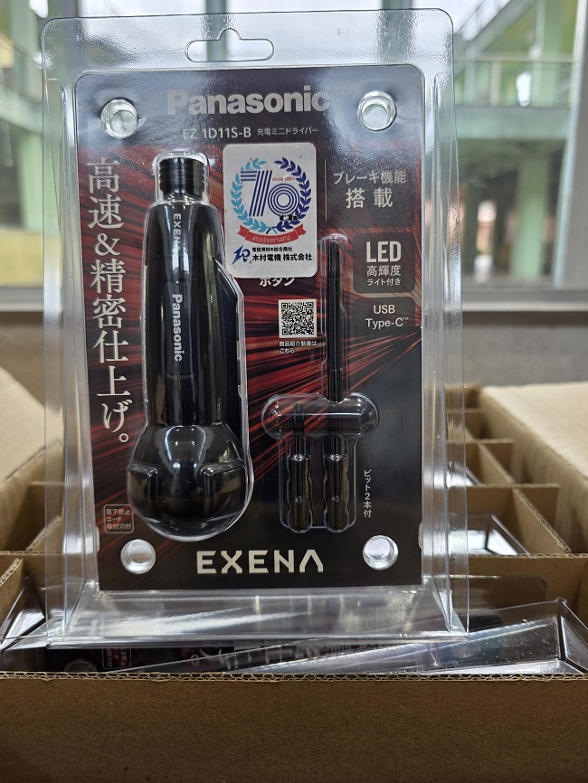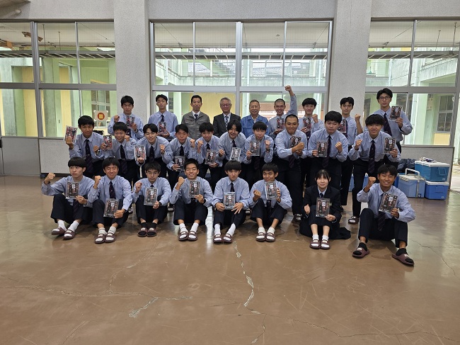木村電機(株)(電設資材の総合商社)の創立70周年記念ということで、熊本県下工業高校の電気・電子科の1年~3年生の全生徒(約1500本)へ贈呈されるということで、本校でも、1年生24本、2年生26本、3年生27本、合計77本の充電式電動ドライバーを寄贈していただきました。