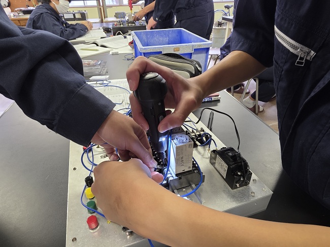 本日戴いた充電式電動ドライバーを、2年実習のシーケンス制御の実習で早速、使用している生徒もいました。LEDライトで接続部分のネジを照らしてくれるので助かります。