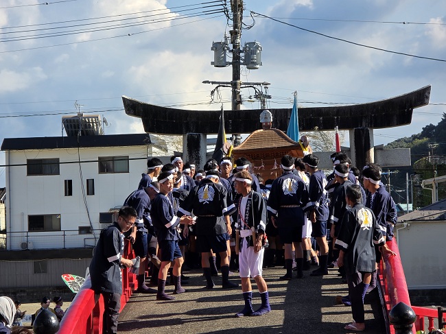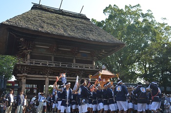 10月3日(金)に半纏卸しが実施されますが、その後、参加団体による提灯行列の後、一文字の竹灯籠に火が灯ります。今年の一文字は『塊』です。10月3日(金)の半纏卸しから始まり11日(土)までの9日間、いろんな神事が実施されます。10月9日(木)は、最大の見せ場である『神輿』を本校では約生徒90名、陵和会(同窓会)25名、保護者15名、職員10名、合計140名で参加します。