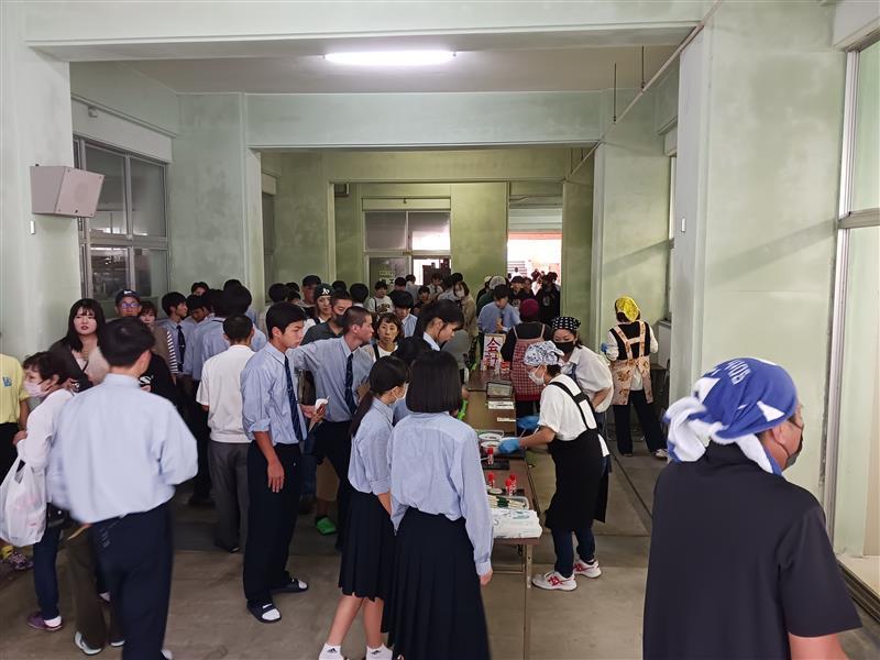 11月2日(土)に球磨工フェスタ(文化祭)があり、育友会では『フランクフルト』と恒例の『うどん』を販売しました。役員を中心に多くの保護者の皆さんにご協力をしていただき、完売することができました。
