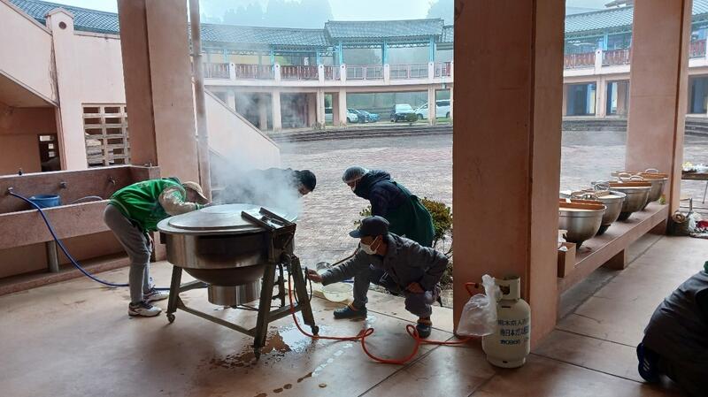 お父さん方による連携プレーで特大大鍋の調整もバッチリでした! 特大大鍋の具材かき回しも見事でした。