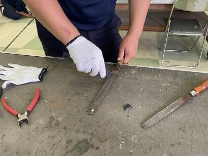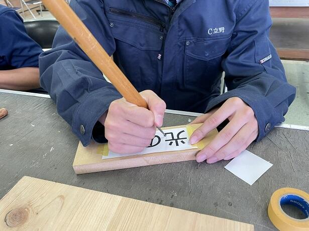 小学生がけがをしないようにバリを取ります。これを板の裏面に接着しました。