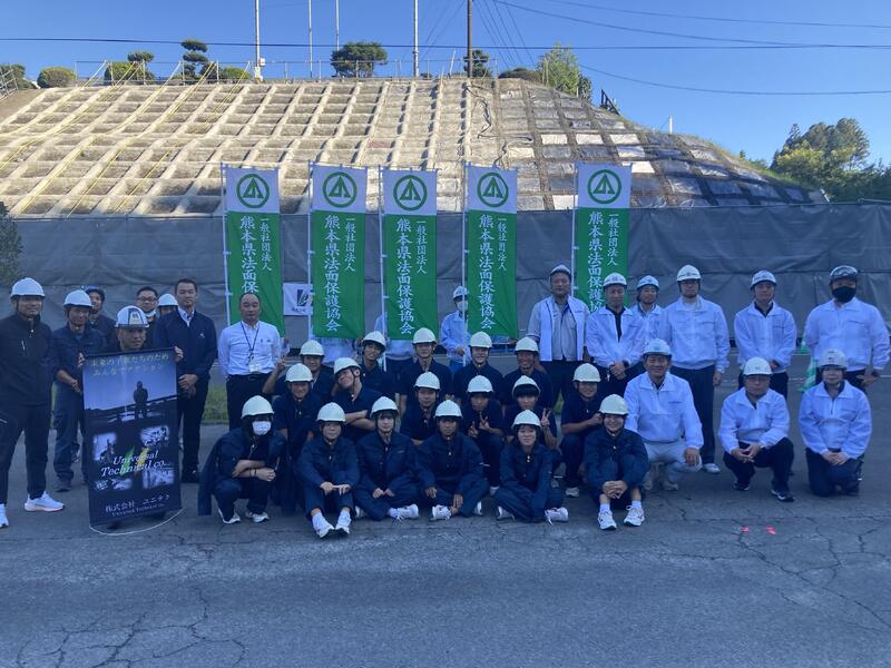 本日、4・5限に法面保護工事の現場体験会が行われました。熊本県法面保護協会様、株式会社ユニテク様のご協力のもと、建設工学科1年生20名が参加し、本校北側法面保護工事を体験させていただきました。