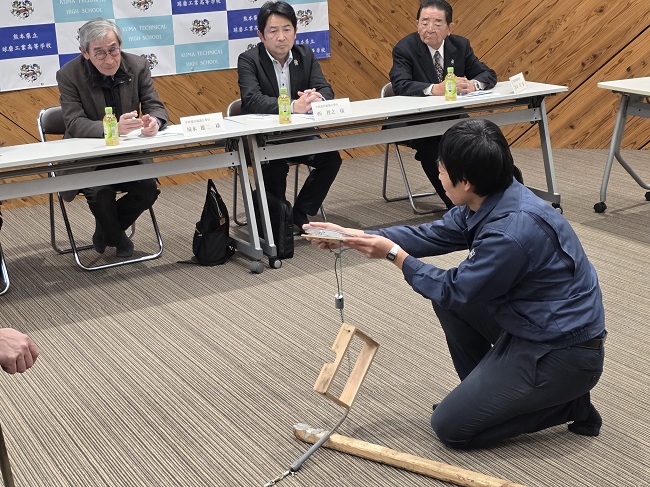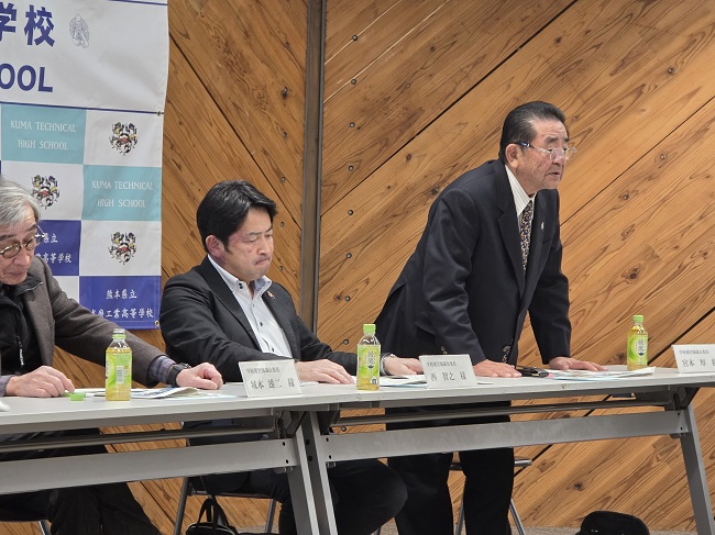 協議会の前に、本校のインスタグラムを見ていただいた後、熊本県生徒研究発表会で最優秀賞を受賞した「くくりわな」の実践が行われました。その後学校長の挨拶、今年度の本年度の取組みや成果を、各部の主任主事・代表により説明後、教頭より学校評価アンケートの集計及び分析の説明がありました。その説明を受けて、学校運営協議員より、下記の内容で活発な意見交換がありました。