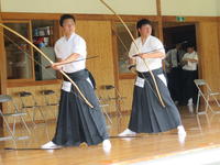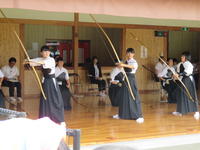 弓道部では、弓師で教士八段の外部指導者の先生よりご指導をいただきながら、日々熱心に練習を重ねています。的中するための練習だけではなく、弓道を通して学ぶ「礼節」を重んじながら、日々自己を高める稽古に励んでいます。部員はみんな仲が良く、総体後の3年生は指導者として、1・2年生が上達するよう一緒に活動しています。
