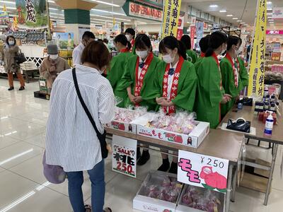 6月10日の当日は、3年生商業科・情報処理科の「チャレンジショップ班」25名がサンロード店内の入口付近で、地元で生産されたフレッシュな桃などを販売しました。