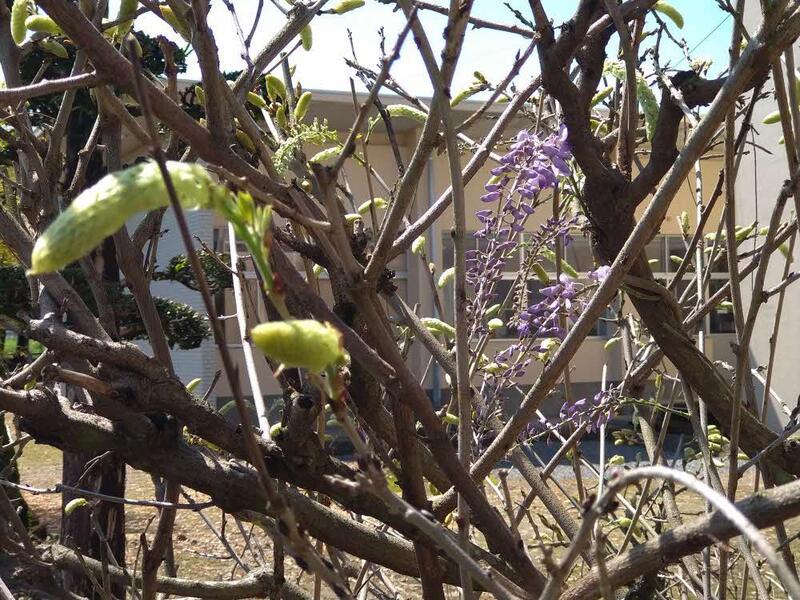 校長室横の庭に藤の花が咲きました。私は恥ずかしながら、藤の花は芽吹いて、少しずつつぼみが開いて、花が咲くのだろうと思っていました。ところが、観察してみると、様々な変容を経て、美しい紫の花となることが分かりました。
