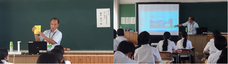 9月11日(水)に3年4組でイスミ商事株式会社、営業・開発部長の嶽本博文様を講師としてお招きし、球磨中央百貨店の招聘授業を行いました。嶽本様には、イスミ商事株式会社様の歴史や経営理念、朝礼、地域貢献についてなど様々なことを教えていただきました。他にも人として成長するために実践する「トイレ磨き」についても話していただき、生徒たちは、百貨店を通して成長するために頑張りたいという表情で真剣に聞いていました。