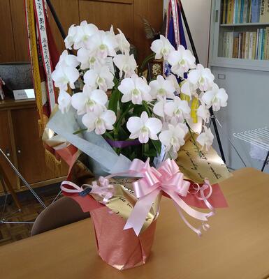 私が本校に着任したときから校長室に飾られている胡蝶蘭。掃除当番の生徒さんが優しく水やりをしてくれるので、今でも美しく、そして可憐な姿を見せています。すがすがしい白色に淡いピンクの花びらを見ると、心がおだやかになります。この胡蝶蘭は、私が昨年度まで勤務していた学校の校長先生が贈ってくださったものです。4月3日に初めて校長室に入った時、この胡蝶蘭が出迎えてくれました。その校長先生はものすごい読書家で、知性にあふれ、3月には生徒の知的好奇心を引き出すような特別授業をされました。とても温かく優しい先生で、常に笑顔を絶やさず、職員や生徒は安心して学校生活を送ることができました。とにかく生徒のことが大好きで、生徒の活躍を何よりも楽しみにされていました。