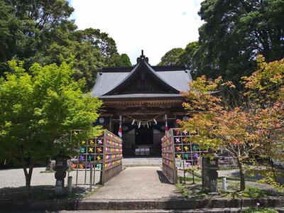 湯前駅から219号線に出て水上村方面に向かって歩き、案内板に従って10分ほど坂道を上ると里宮神社に着きました。市房山神社をおがむ場所で、戦国時代に築かれた湯前城跡にあります。勇壮な木彫りの龍が出迎えてくれます。