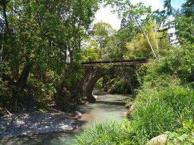 神社を後にして歩くこと7~8分、球磨川支流の都川に下町橋(したまちばし)がかかっています。1906年(明治39年)にかけられた石橋で、清らかな都川と木々の緑の間で美しい姿を見せています。
