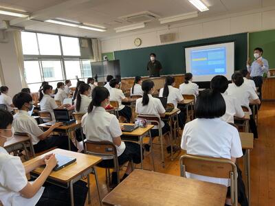 普段は画面越しにスーパーティーチャー川元先生の授業を受ける2年1組ですが、この日は学期に1度行われる授業者訪問の日!