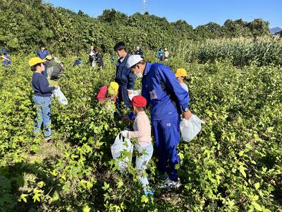 調査研究班のメンバーは、小学校低学年の児童たちとともに、和綿の収穫を楽しく行っていました。その様子をお届けします。