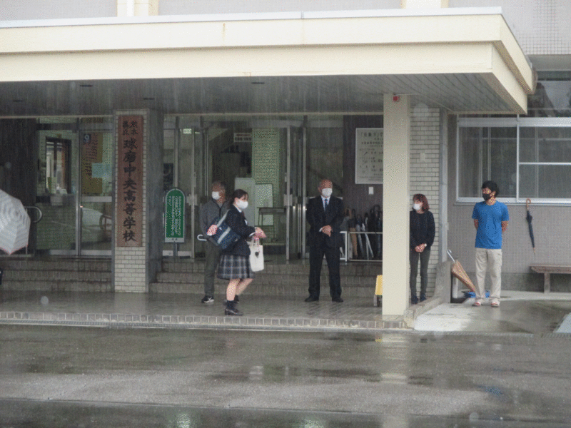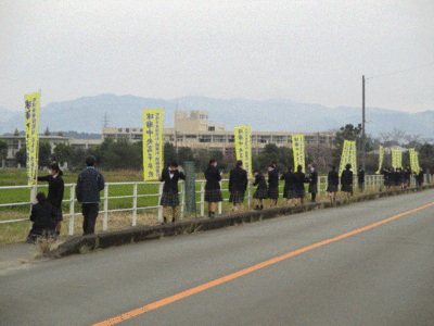 人吉球磨地区の高等学校で「代替バスを補助し、生徒の乗降マナーアップを目指そう!」と題して、各校の育友会の役員の方々による、代替バスの停留所での挨拶運動が実施されました。写真は肥後西村駅に替わり、バス停となっている球磨中央高校での様子です。保護者の皆様、早朝よりありがとうございました。