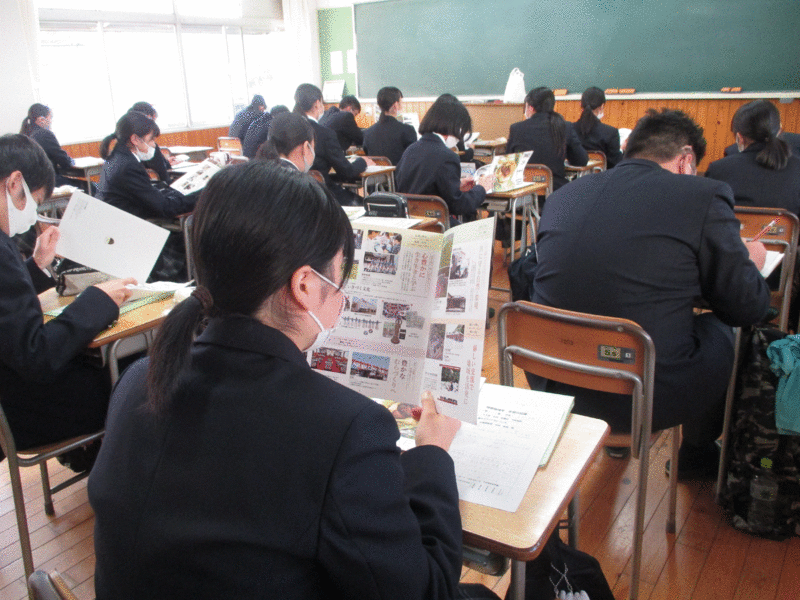 本日7限目、1年生は体育館にて山江村からご講演をいただきました。やまえ栗をブランド化するために取り組まれたことを教えていただき、さらに山江の栗やくりまんじゅうが好きになり、地元の特産物をPRすることの大切さを発見できたようです。写真は講演後、教室にて、いただいたパンフレットを熟読している様子です。