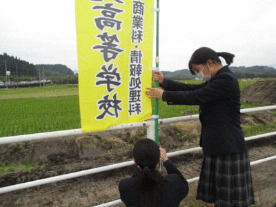 本日5限目は、3年生商業科・情報処理科の課題研究の時間に、ポスター作製班による「球磨中央百貨店のポスター発表」が行われました。どのようなコンセプトで作製したか発表後、地域へポスター掲示のお願いに伺う打ち合わせを行いました。6限目は、学校前の道路にのぼり旗の設置を行い、いよいよ球磨中央百貨店が近づいてきていることを実感しました。