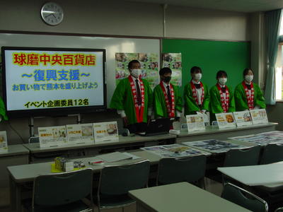 各クラス(店舗)の「目玉商品」をパワーポイントにまとめ担当者が力を込めて説明しました。今回のコンセプトは、「復興支援~お買い物で、熊本を盛り上げよう~」です。高校生の若い力でお客様を引きつけ、復興支援のために多くのお買い物をしていただき盛り上げていきましょう。お客様のご来店を心よりお待ちしています。