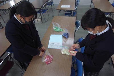 3年生のあるクラスでは、協賛企業の山上商店様にお越しいただき、お店の歴史や商品の販売方法等について、お話しいただきました。わざわざ本物のPOPを準備されてお客様に購入していただくために必要な情報とはどのようなものかをお話ししていただき、生徒もメモをとりながら聞いていました。また、放課後には各課の課長会が行われ、経理課ではお金の数え方を練習できるよう模擬貨幣が配られました。