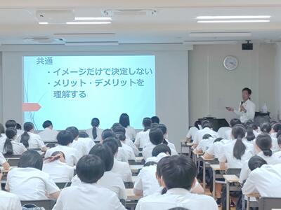 6限目は全学年の人権LHRが行われました。1学年は「人権としてのアサーション」と題して、1学年の人権担当の荒木先生より講話がありました。荒木先生の講話の中で、生徒たちは質問に積極的に発言したり、周囲と話し合ったりする場面が多く見られました。