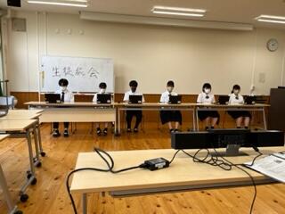 教室では、生徒会会員である生徒一人一人が、Googleクラスルームにアップされた資料を見ながら、生徒会役員の説明を聞いたり、教室から拍手で賛成を伝えました。