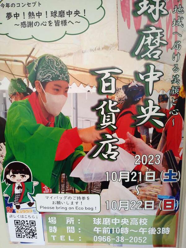 今年のポスターは、緑色を基調とし、「球磨中央百貨店」の文字が浮かび上がってくるようにデザインされています。今回の百貨店のコンセプトは「夢中!熱中!球磨中央〜感謝の心を皆様へ〜」。9月に入り、店長・課長会議とその報告会が毎週行われています。生徒の活動もいよいよ本格化してきました。「地域に届ける笑顔と心」のキャッチフレーズのもと、お客様の笑顔であふれる百貨店を目指します。ポスターを見かけられましたら、ちょっと立ちどまっていただき、生徒の思いを感じていただければ幸いです。