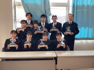 今年度、3年生課題研究の一環で錦町と連携して商品販売を行う、「錦町チャレンジショップ」を行い、JA球磨さんの「球磨栗プリン」「球磨栗プリンプレミアム」を販売し、すべて完売されたことを受け、今週月曜日にJA球磨営農部部長の渡瀬様よりお礼としてチャレンジショップ班9名に「球磨栗プリン」と新商品である「球磨茶プリン」を贈呈して頂きました。生徒はとても喜んでいました。来年度も新三年生が錦町と連携して商品販売「チャレンジショップ」を行いますので、ぜひお越しください!