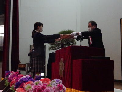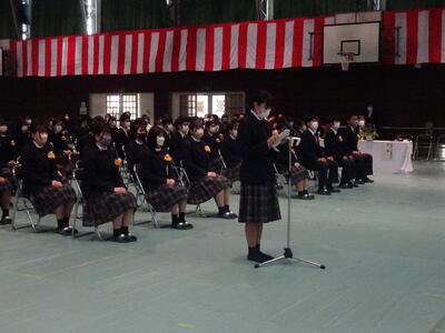 地域未来探究科、商業科2クラス、情報処理科の代表に卒業証書が授与された後、校長式辞、教育委員会あいさつ、来賓祝辞、在校生代表2年生の坂本さんの送辞、卒業生の西さんの答辞と続き、最後は全員で校歌を斉唱しました。