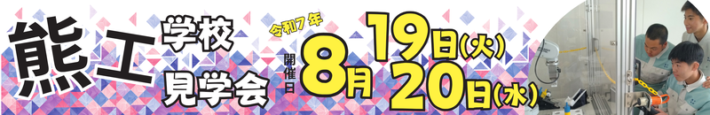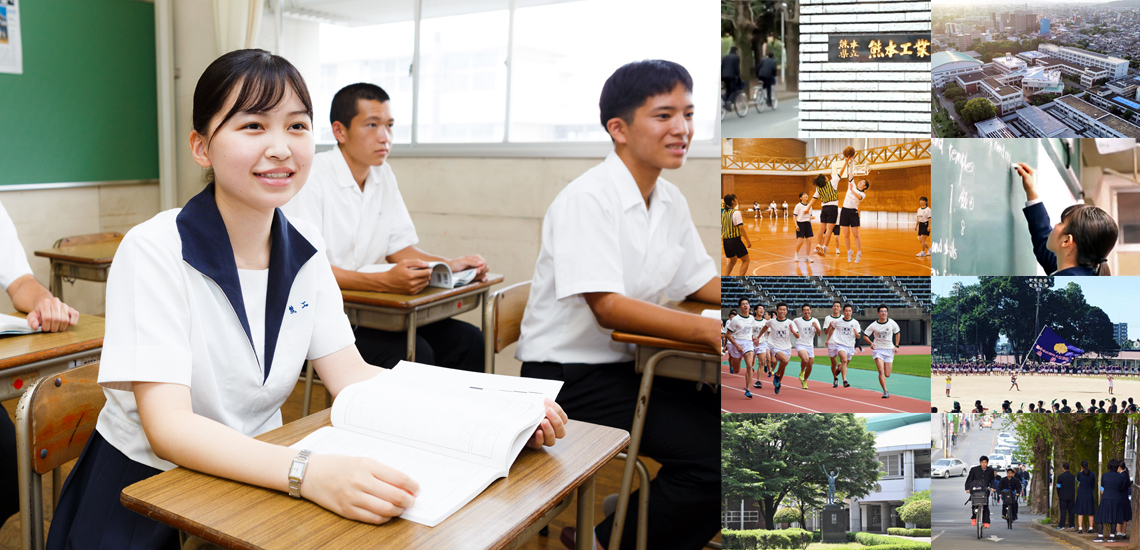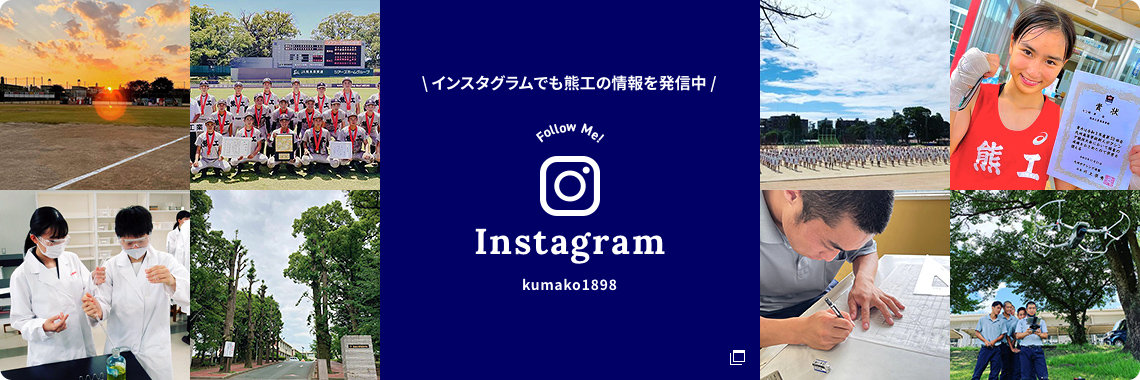 この伝統ある熊工に入学し、高い志と自主自立の精神のもと、専門教科や実験・実習をはじめとする様々な学習をとおして知識と技能を身につけ、さらには県内トップレベルの体育系(20部)・文化系(18部)の部活動や生徒会活動、ボランティア活動などの様々な体験により、人間力を高めてみませんか。