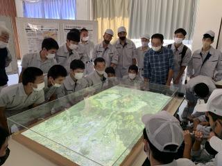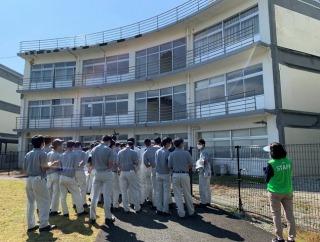 阿蘇神社では、プロジェクターを用いて、文化財建造物保存技術協会・清水建設株式会社より、熊本地震による被害の状況や楼門の耐震補強として用いる鉄骨フレーム、柱の継手として用いるアラミドロッドなどの説明をしていただきました。その後、実際に作業中の楼門や古材の加工場などを見学し、作業状況や施工・管理方法などの見学を行いました。旧東海大学阿蘇キャンパスでは、熊本地震によって被害を受けた校舎や断層などを見学しました。また当時を知るガイドの方から、熊本地震時の状況や体験談などの説明をしていただきました。生徒は「阿蘇神社の耐震工事や旧東海大学阿蘇キャンパスの被害状況を見ることができて、新たに耐震についての知識を学ぶことができた。柱の継手にアラミドロッドという技術が使われており、自分の知らない技術を実際に見ることができて勉強になった。地震による建物の被害だけではなく、改めて地震の恐ろしさを感じることができた。また命の大切さを再認識することができた。」と感想を述べていました。