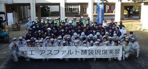 土木科ではインフラ復旧に貢献できる技術者の育成を目指して研究を進めているが、今回、校内のアスファルト舗装実習を(一社)熊本県道路舗装協会の御協力により実施しました。内容は、機械施工、維持修繕工法、カラー舗装、仮復旧体験です。