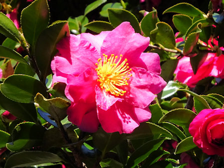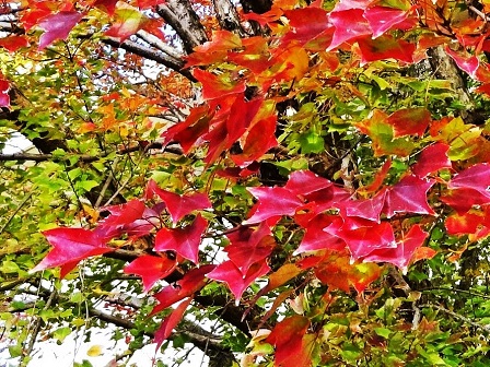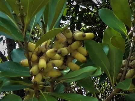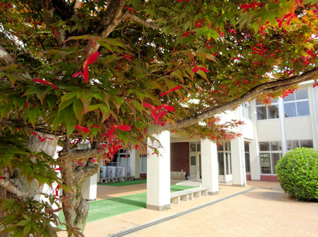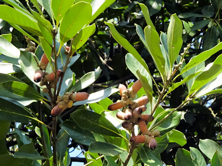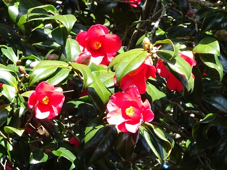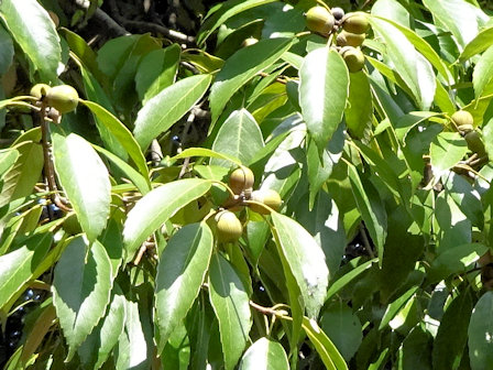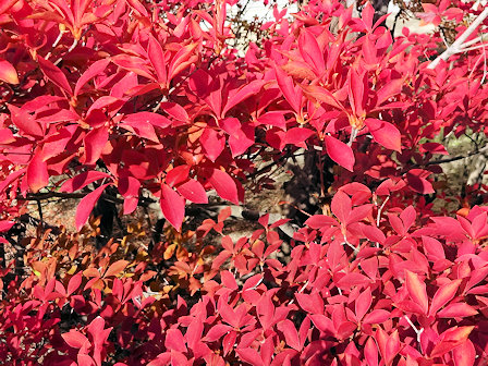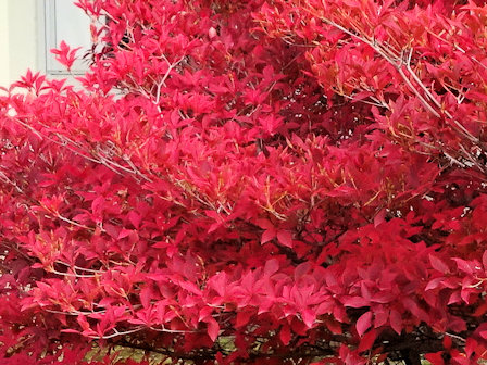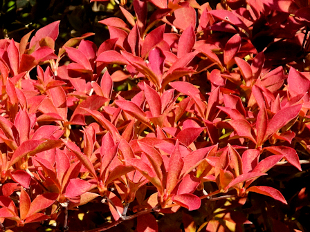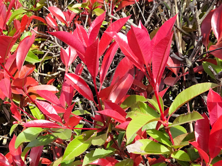 (赤い新芽が特徴です。白い小さな花が咲き、花が終わると赤い実がつきます。)