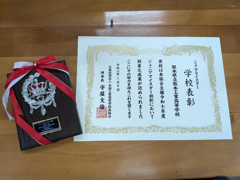 このたび本校は令和7年度ジュニアマイスター顕彰において学校表彰をいただきました。