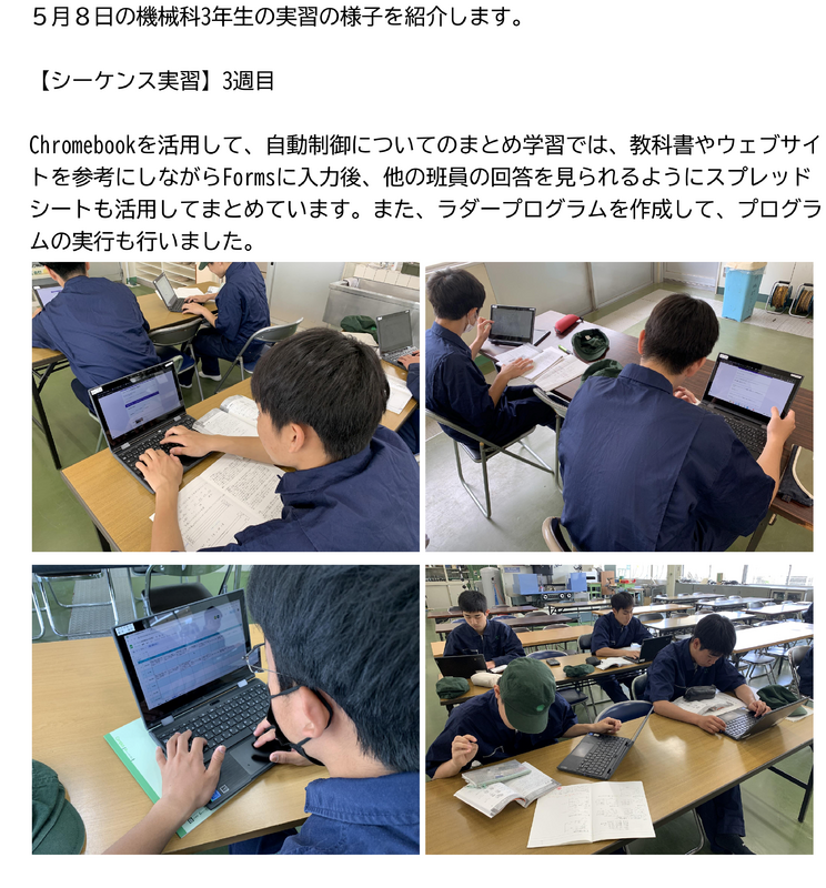 機械科3年生がオンライン授業を受講しました。自動車の歴史からガソリン、ディーゼル、電気自動車の違い、デジタル技術がどんな役割りを果たしているかなど、とても実りのある授業でした。また、インドのITエンジニアの方との英語による講義もあり、英会話力の大切さも実感しました。機械科3年生の皆さん、9月から就職試験が始まりますが、この貴重な経験を今後の就職活動に生かしてください。