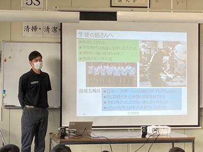 11月4日(金)から7(月)にかけて千葉県で行われた技能五輪全国大会において、令和2年度機械科卒の長家圭佑君が日産自動車㈱より初出場し3位(銅メダル)を獲得しました。自動車板金職種に出場しましたが、日産自動車㈱の社内においても快挙の結果だそうです。今回機械科の生徒にその高い技能に触れ、今後の進路に役立てて貰うための報告会を開催しました。技能五輪の概要説明や実演を行い、とても実りある時間となりました。次年度は金メダルを受賞し、フランスで開催される国際大会に出場できるよう祈念しています。(※技能五輪全国大会は、国内の青年技能者(原則23歳以下)を対象に、技能競技を通じ、青年技能者に努力目標を与えるとともに、技能に身近に触れる機会を提供するなど、広く国民一般に対して技能の重要性や必要性をアピールし、技能尊重を高めることを目的としている大会です。)