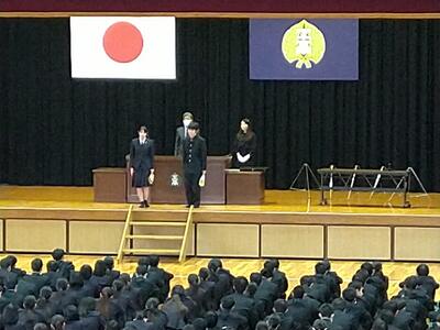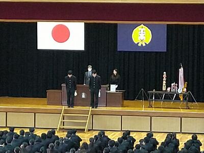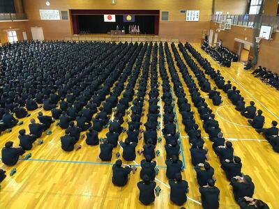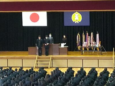 2学期制となって1年目の後期修了式が行われました。式の中で電気2年のジュニアマイスターゴールド11人、シルバー9人が表彰を受けました。また、全国大会に出場する生徒へ応援団の激励・校歌斉唱もありました。皆大変よく頑張った1年でした!