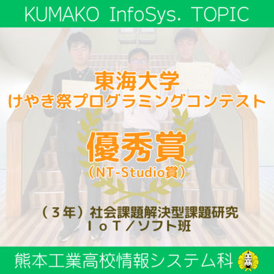 11月3日(金・祝)東海大学熊本キャンパスの学園祭「欅祭」でのプログラミングコンテストにおきまして、3年課題研究班の入部・垣田・森田さんの3人の応募が予選を通過し、本選にて優秀賞(NT−Studio賞)を受賞しました!