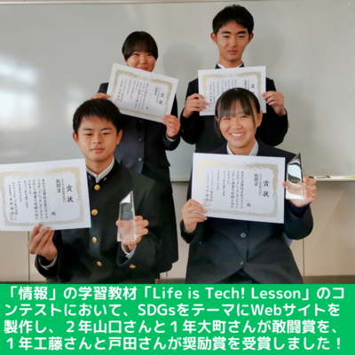 教科「情報Ⅰ」におけるクラウド型学習教材「Life is Tech!~Lesson」のコンテストにおいて、情報システム科1・2年生が出品しました。その結果、[敢闘賞]に2年山口さん・1年大町さんが、[奨励賞]に1年工藤さん・戸田さんが受賞しました!