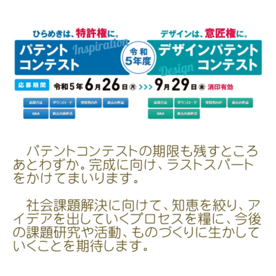 この活動は、秋に予定されている「パテントコンテスト」への応募に向けた基礎づくりでもあります。生徒たちは、社会課題に目を向け、自分たちなりの解決策や発明・提案を考えていくプロセスをスタートさせています。