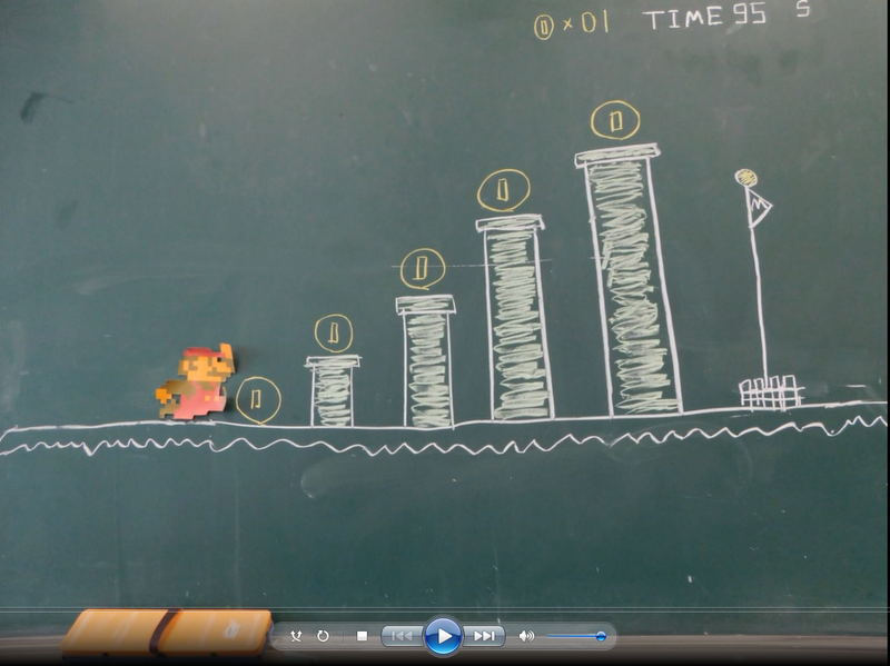 黒板にステージを描き、キャラを動かしながら撮影をしました。効果音を付けたのでとてもおもしろい作品になりました。(これは静止画です。動画は文化祭で!)