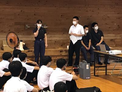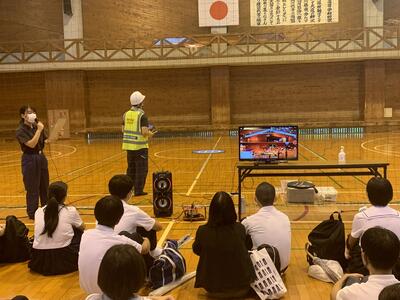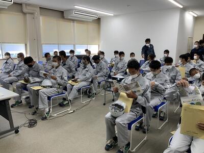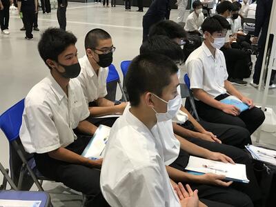 講話では、仕事内容ややりがい、現在取り組んでいる現場のお話など、建設業の魅力を教えていただきました。1年生からは高校生活に打ち込んだことや仕事に関して質問があり、体験談や今やるべきことなど、具体的に教えていただきました。