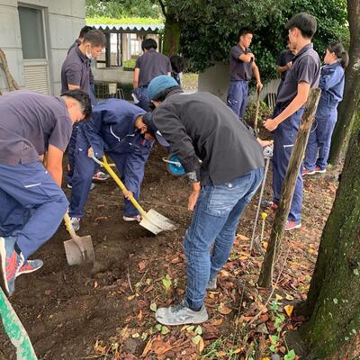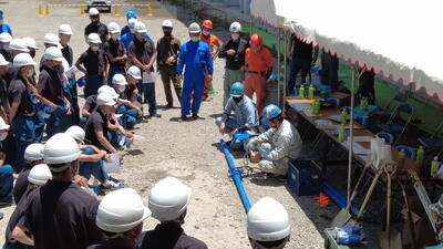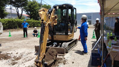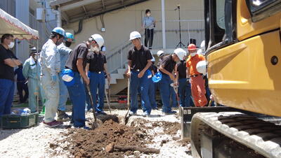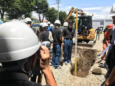 熊本市管工事協同組合様に来校していただき、管工事実習を行いました。今年で4年目です。今年は配水管の埋設工事実習と止水実習でした。埋設工事では、バックホウで掘削を行い、砂を敷き、レベルで高さを調整、管を埋設して、蛇口から水を通しました。