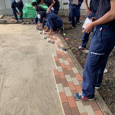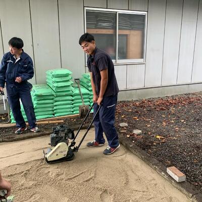 エクステリア実習として、体育倉庫裏のスペースにインターロッキングを施工して休憩スペースとして造りました。