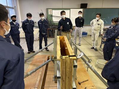 熊友会型枠協同組合3名の技術者(本校建築科卒)の方に来校いただき、ご指導していただきました。