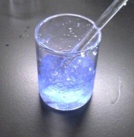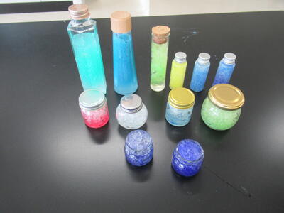 3年生の課題研究に一つに吸水性ポリマーの合成があります。吸水性ポリマーとは、100倍以上の水を吸うことができる合成樹脂で、紙オムツや芳香剤、保冷剤や土壌改良材などに使われています。今回は、一般的に使われているアクリル酸を原料として合成しました。最後に自分で好きな色と香りを使って、特製の芳香剤を作ってみました。