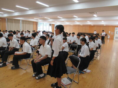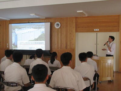 7月9日(水)に熊本県工業化学科3校で取り組んでいるOne-Team事業の一環として、三菱電機パワーデバイス製作所熊本事業所の説明会が行われました。講師として人事の種村様と本村様に来ていただき、熊本事業所の説明と半導体の製造工程について詳しく説明して頂きました。パワー半導体が生活の色々な所に活用されており、今後のEV車などにも欠かせないこと、また半導体の製造工程において化学の知識が活かされていることについても理解することができました。今回の説明会の内容を今後の進路にしっかり活かしたいと思います。