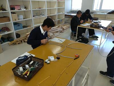 間もなく1年生は高校初めての資格試験、2年生は第二種電気工事士実技試験を迎えます。毎年この時期に、3年生の電気工事に関する高度な知識と熟練した技能を伝える『伝承授業』を行っています。80人が注目する中、水平垂直がとれた基準線上に、器具の取り付けやケーブル・金属管工事を手際よく行う姿を見せることができました。そんなすごい先輩に追いつけるように、今できることをしっかり頑張りましょう。きっとできる。