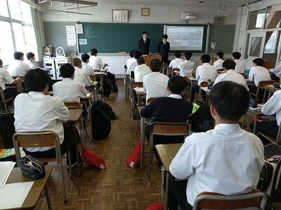 住友電気工業㈱から、大阪製作所人事グループ長と所属する卒業生が来校されました。企業概要や業務の説明を丁寧にしていただき、皆真剣に話を聞いていました。ワイヤーハーネスや人工ダイヤモンドなど何でも作れることが企業の強みであるなど、とても貴重な時間を過ごすことができました!