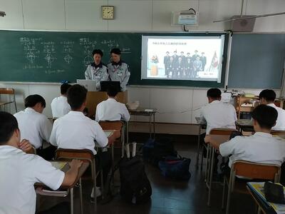 ㈱九電ハイテックから、発変電グループ長と卒業生が来校されました。企業概要や業務の説明を丁寧にしていただき、皆真剣に話を聞いていました。送電部門と発変電部門の動画や画像での様子、特別高圧のプロフェッショナルとして電気の安定供給に貢献されていることなどが理解でき、とても貴重な時間を過ごすことができました!
